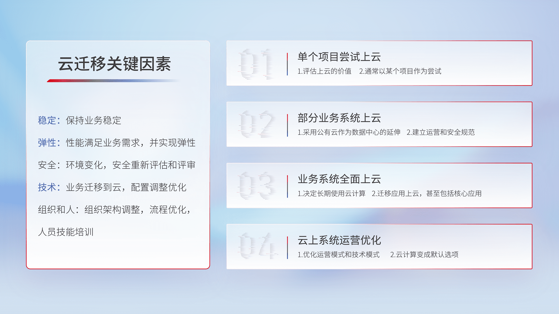 结合实际业务,,,从规划设计、、、、云平台选型、、、云原生改造、、、数据迁移、、、集成交付,,,,迁移全过程为客户识别最佳上云路径,,,,做好风险识别管理,,,设计网络架构、、、身份权限、、安全审计合规、、、、操作审计、、日志审计、、监控告警策略、、、、多站点容灾设计等,,对云上基础设施进行整体规划,,,提升IT治理水平,,以满足弹性、、、、高可用、、高性能的需求。。。。