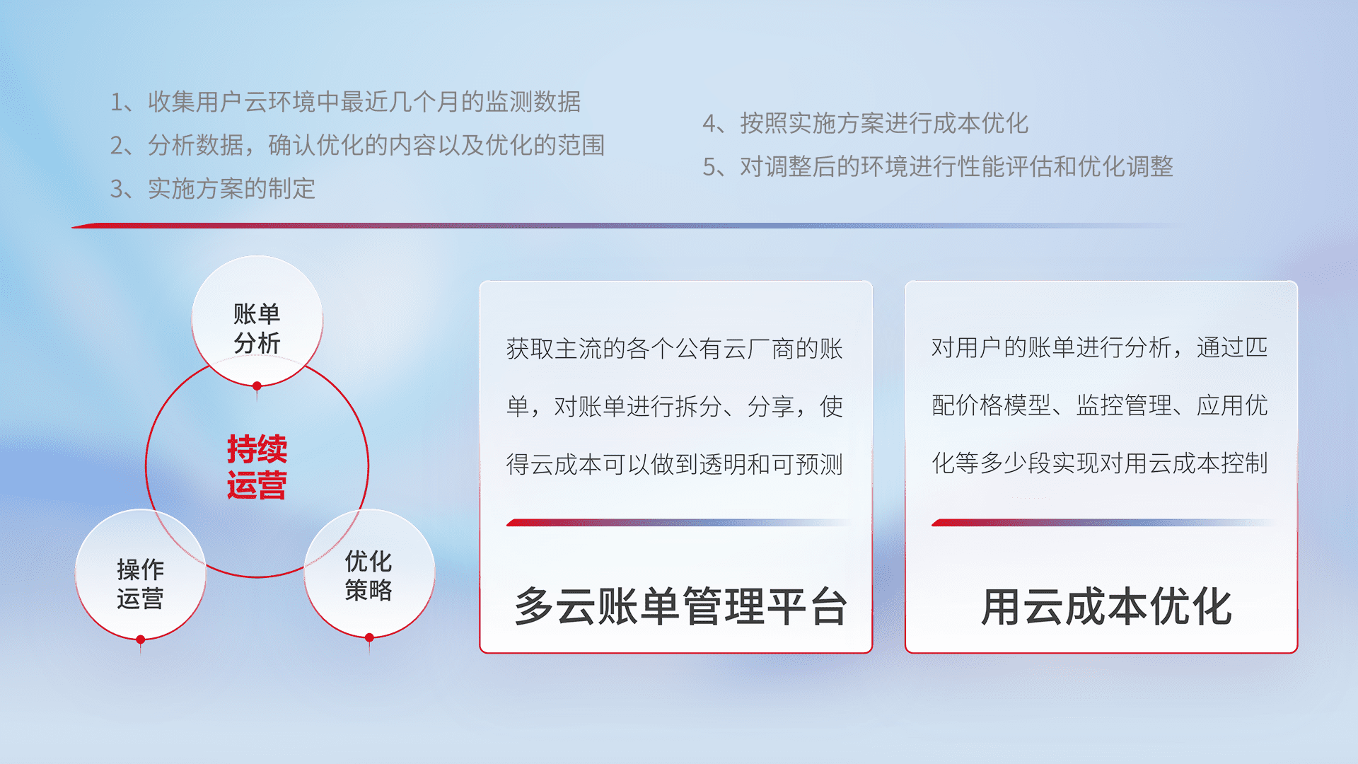 通过多云纳管,,,以统一的资源数据模型把客户的云资源进行抽象和封装,,进而实现对多云资源的统一操作,,,保障云资源管理的可靠性、、、、稳定性与可用性。。。。量身定制化运维内容,,,,配置、、、开发运维、、、、补丁管理、、、备份、、、监控、、认证和访问管理、、、、审计和日常巡检等,,,保障在用云过程中的可靠度,,,,稳定度以及高可用率。。。。